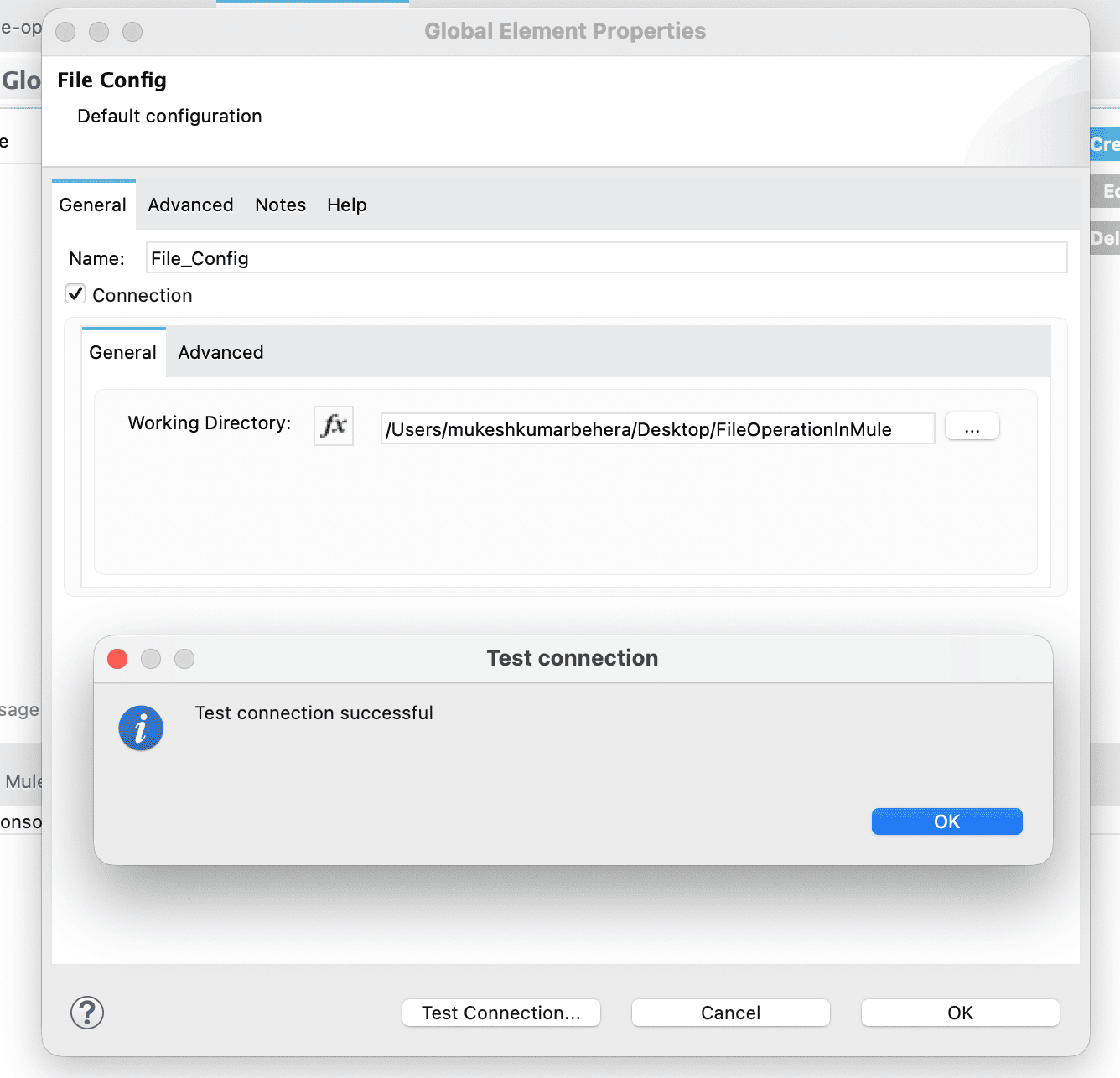 - Once the pop-up opens, check the Connection checkbox, select the working directory as the folder you created in the previous step, then test the connection and click OK.