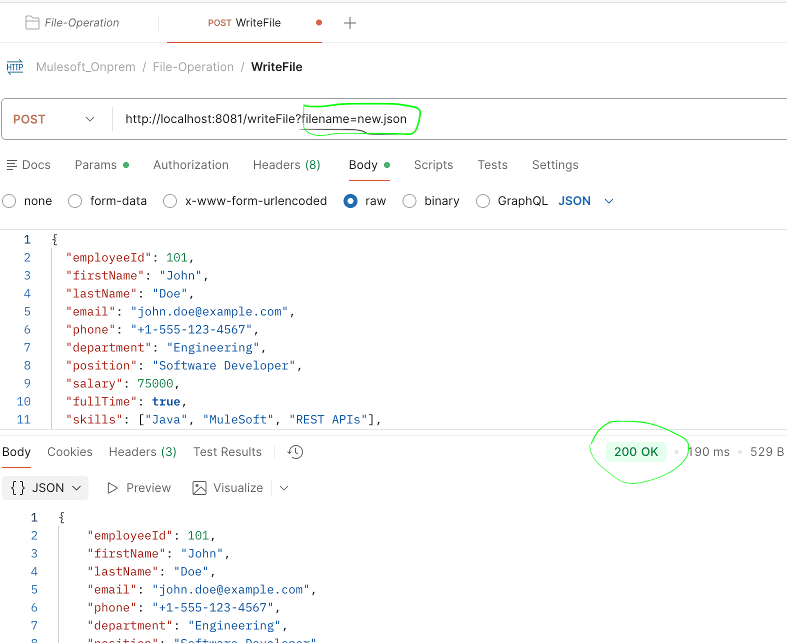 - Once the Mule application is deployed, call the endpoint from Postman by passing a filename in the query parameter and including the payload in the request body. Once the application runs successfully, you will notice that the file is created in the specified location. If you call the same endpoint again with the same filename but a different payload, the file content will be updated with the new data.Your mule flow will look like below :