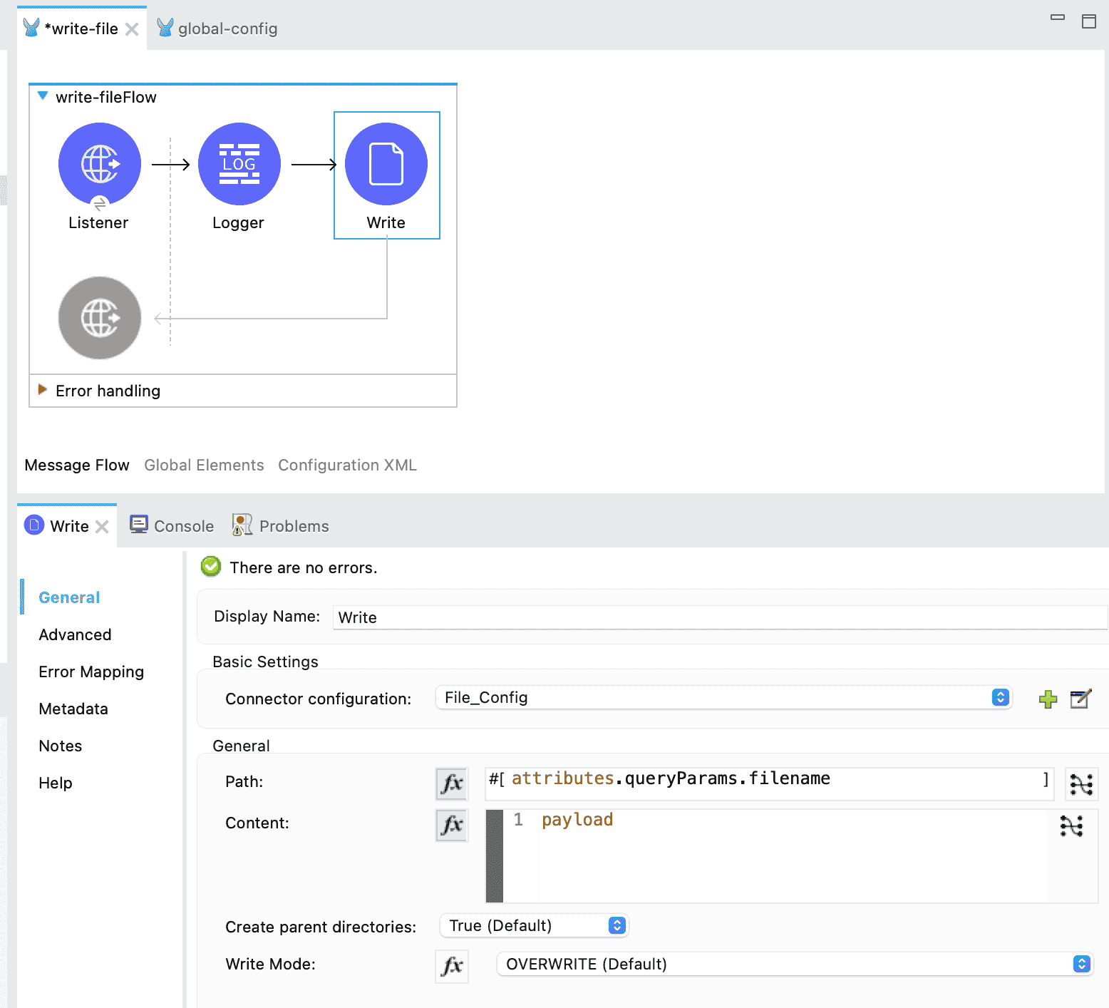 #[attributes.queryParams.filename]so that the filename is extracted from the query parameters and the file is saved with the same name in the file system. - Keep other settings as default. The Write Mode is set to Overwrite by default, which means if a file with the same name already exists, its content will be replaced with the new content.